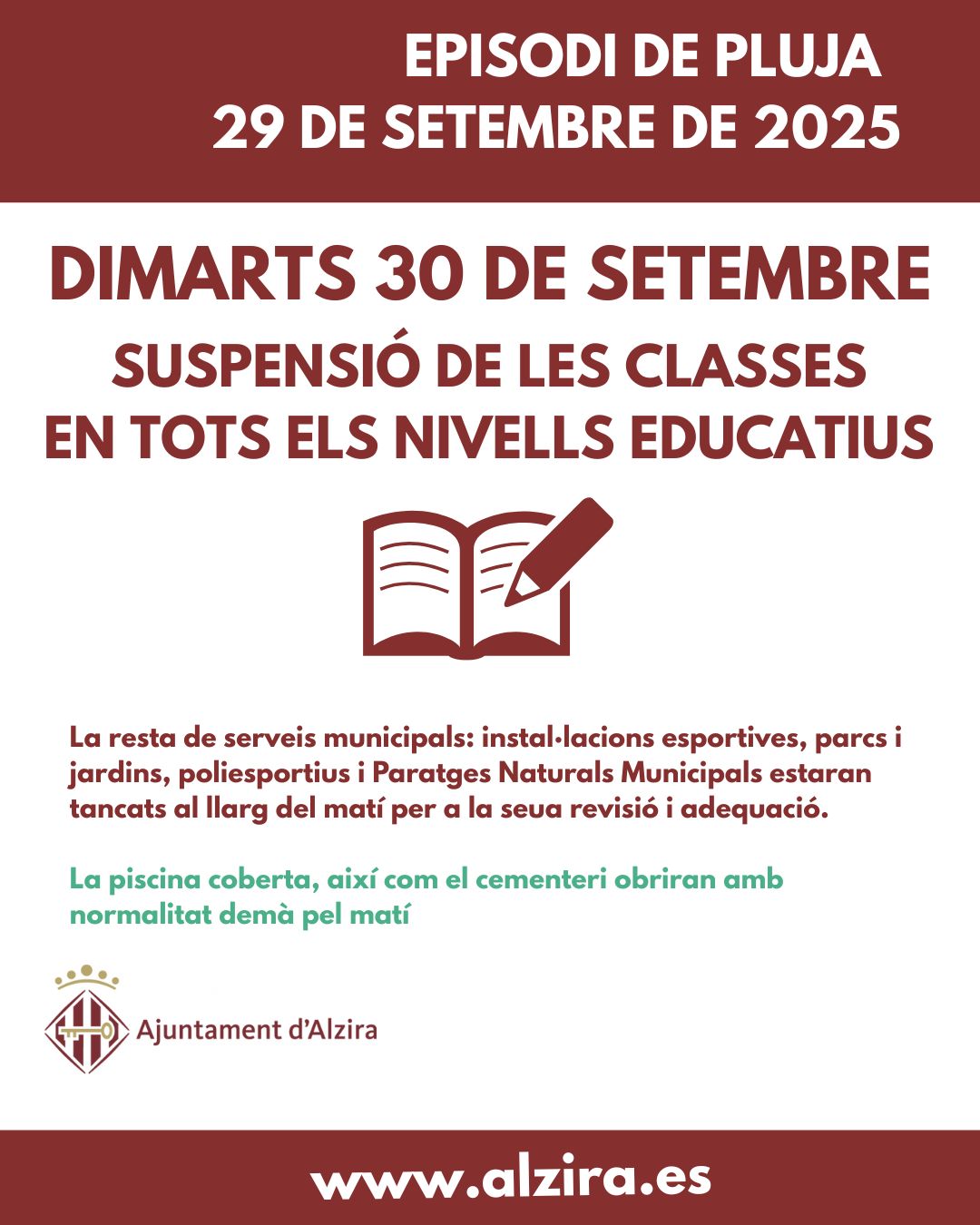 π©βππ§βπSUSPENSIΓ ACTIVITAT LECTIVA per a demΓ en tots els nivells educatius a la ciutat d’Alzira.