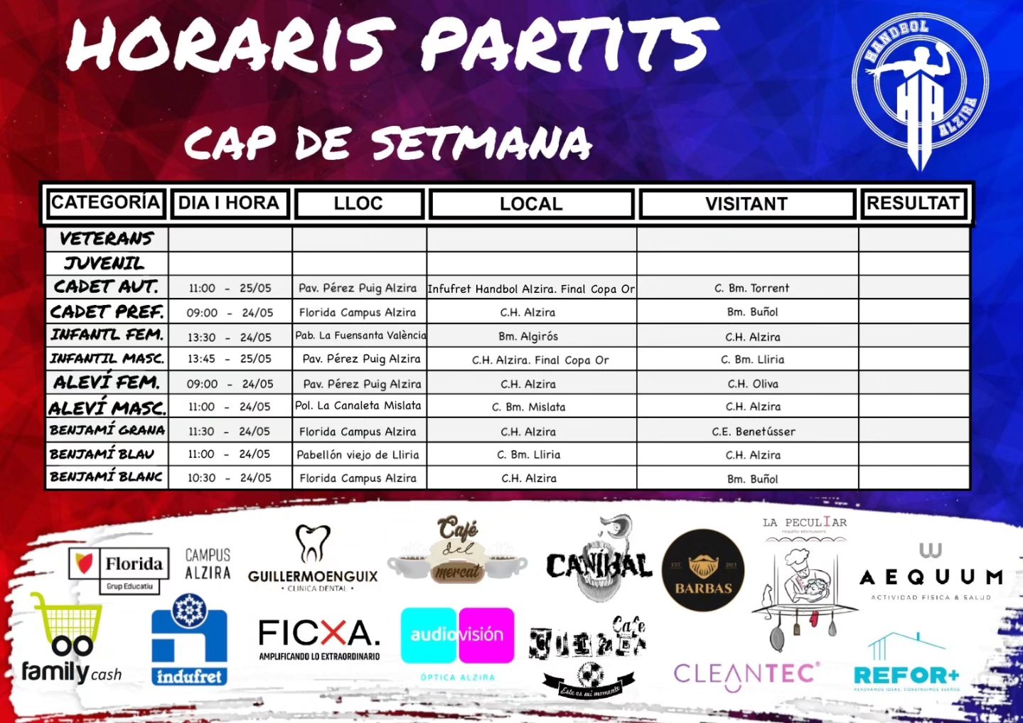 Aquí tens el resum dels partits del cap de setmana per al Club Balonmano Ribera Alta Alzira: Dissabte 24/05/2025 C. Bm
